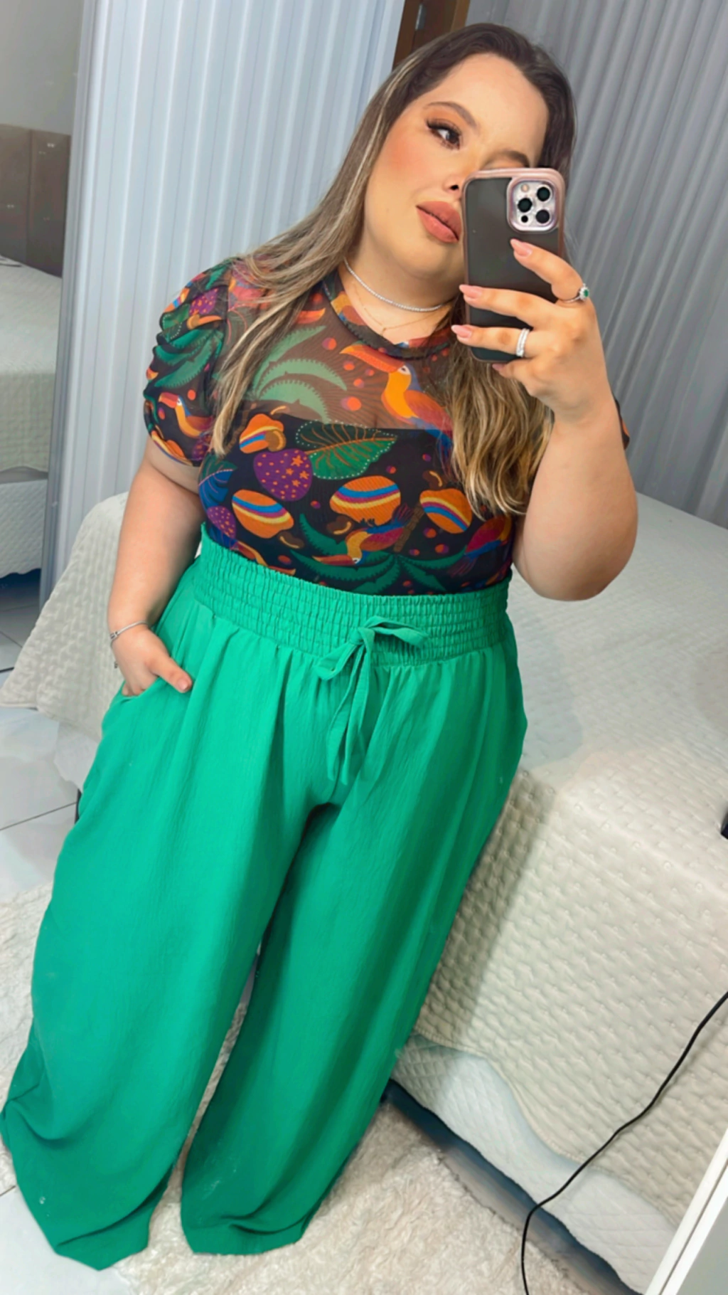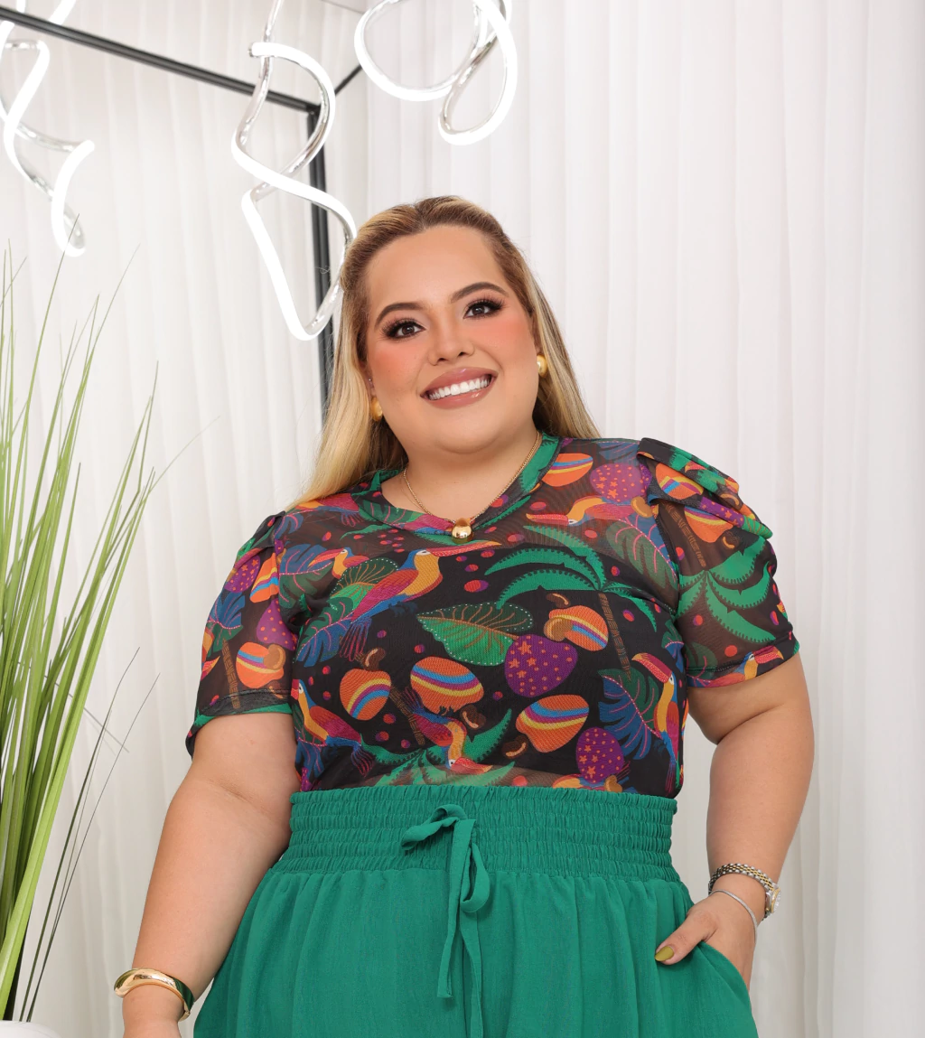 A Blusa no Tule de Malha é uma peça leve, fresca e cheia de estilo. Feita com tule de malha, ela traz um toque de transparência que confere um visual elegante e moderno. Perfeita para os dias mais quentes, seu material garante conforto e frescor, sem perder o charme. A blusa conta com manga curta princesa, que proporciona um caimento delicado e estruturado, dando um toque de sofisticação à peça. Seu design versátil veste do tamanho 44 ao 54, oferecendo uma modelagem inclusiva que se adapta com facilidade ao corpo, proporcionando conforto e estilo para diferentes silhuetas.